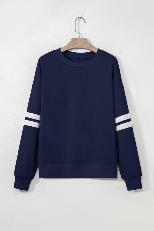 Navy Blue Preppy Striped Sleeve Loose Sweatshirt